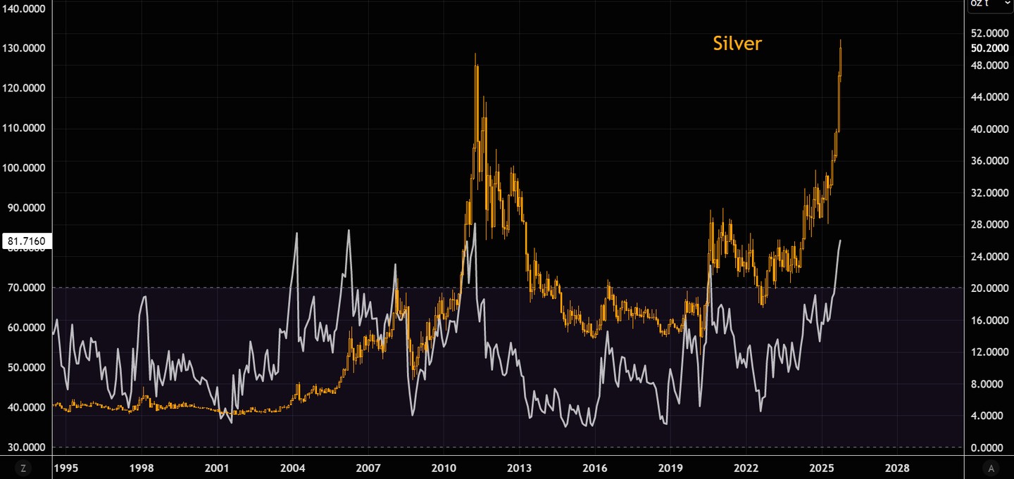 本輪銀價大漲受益於倫敦市場供應緊張、工業需求與避險需求。若美元貶值,對白銀的推升會超過黃金,同時金價漲也帶動銀價走高。分析警告,技術指標顯示金銀嚴重超買,歷史上美元走強的時期往往伴隨黃金暫停上漲或出現調整。