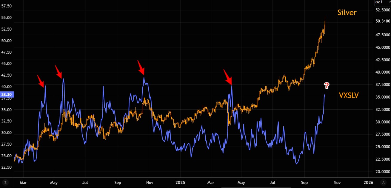 Cboe 白銀 ETF 波動指數(VXSLV)更是出現爆發式上漲,過去一年中每次波動性激增都伴隨着白銀的喘息或調整。