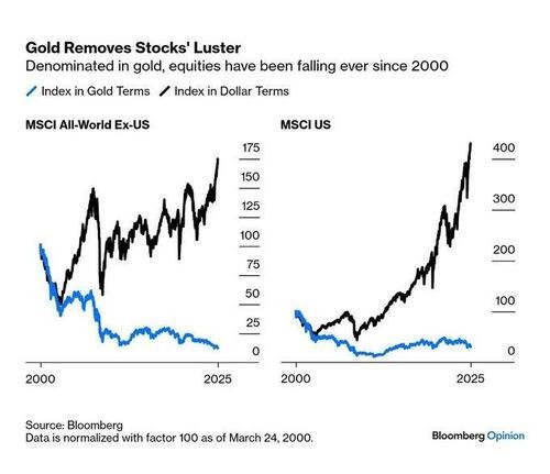 If the global stock market were priced in gold instead of US dollars, US stocks have been declining since the burst of the internet bubble 25 years ago... Stocks elsewhere in the world have performed even worse.
