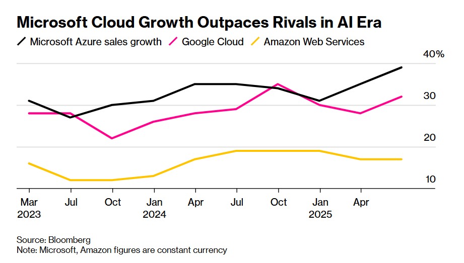 Azure is currently Microsoft's most important growth engine—this cloud business is expected to exceed $75 billion in revenue in fiscal year 2025. Its cloud computing business is expanding at a pace that has significantly outstripped its largest competitors, Amazon.com Inc. and Google Cloud Platform under Alphabet Inc. As shown in the above image, Microsoft's Azure cloud computing platform continues to outperform major competitors Amazon and Google in performance growth during the AI era.