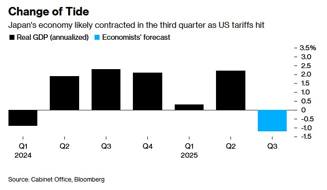 日本經濟在連續五個季度增長後,可能在第三季度出現收縮,原因是美國關税政策對出口造成衝擊。經濟學家預計第三季度 GDP 將同比下降 1.2%,而之前預期為微增 0.1%。日本央行可能會放緩加息步伐,因關税影響經濟。預計第三季度出口將環比下降 4%。儘管與美國達成貿易協議,關税仍高於之前水平,給出口企業帶來壓力。