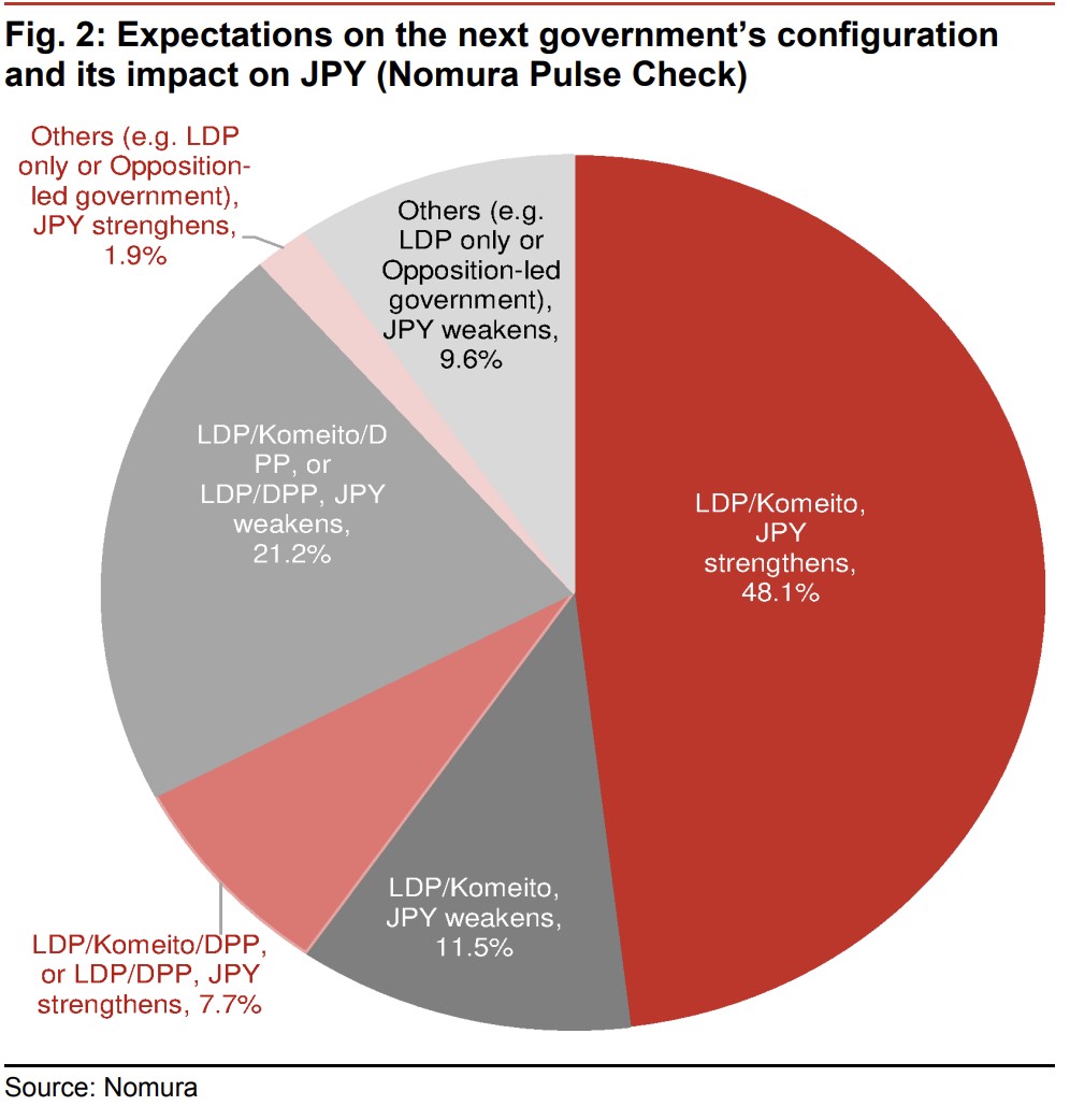 Nomura Securities' analysis points out that the outcome of the ruling coalition will have drastically different impacts on the yen: