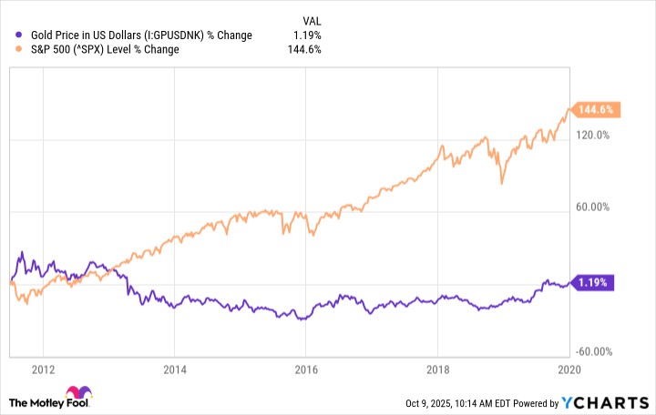 For example, had you bought gold in June 2011, you would have earned no return for nearly an entire decade. Meanwhile, the S&P 500 climbed by a whopping 144% over the same period.
