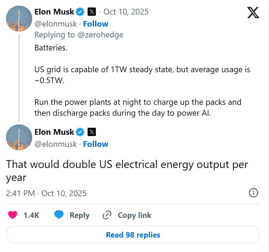 Recently, Musk stated on social media platform X that the U.S. power grid has a stable output capacity of about 1 trillion watts, but the daily usage is only 0.5 trillion watts. By operating power plants at night to charge battery packs and releasing electricity during the day to support AI computations, it could "double the annual electricity generation in the U.S." He called large-scale industrial-grade batteries the winning solution for stabilizing the grid.