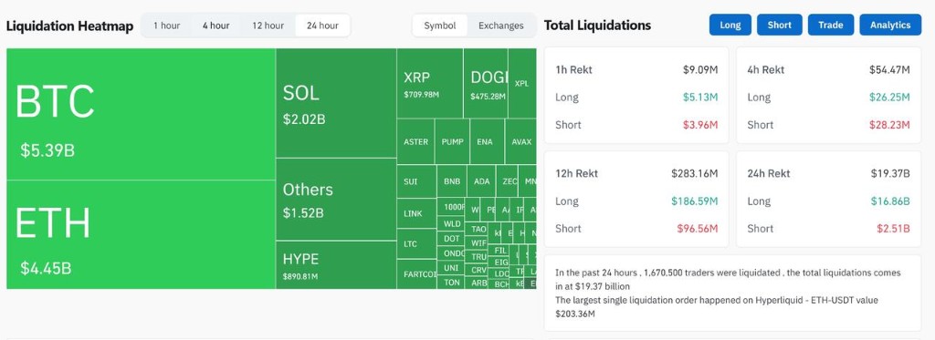 近 200 億美元的灰飛煙滅或許還相對保守。CoinGlass 在社交平台上 X 談到這些數字時表示:“實際總數可能要高得多——幣安每秒只報告一個清算訂單。”