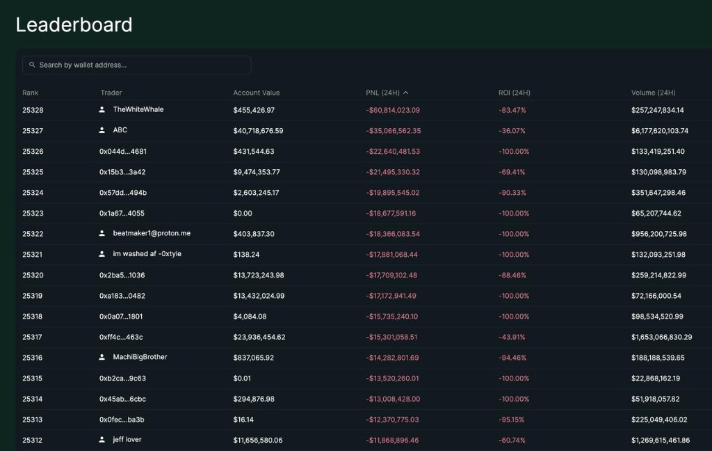 據社交媒體賬户 @LookOnChain 披露,在這次市場崩盤中,Hyperliquid 上有超過 1000 個錢包被完全清空,另有超過 6300 個錢包處於虧損狀態,合計損失超過 12.3 億美元。