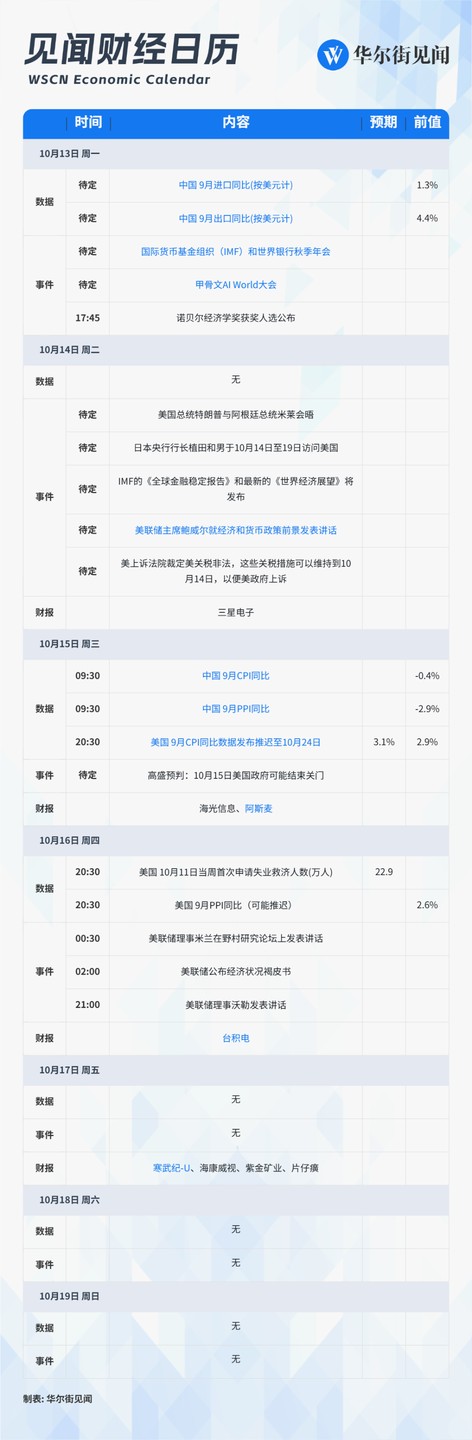 美國 9 月 CPI 因政府停擺推遲至 10 月 24 日發佈,高盛推測 10 月 15 日政府可能結束關門。甲骨文 AI World 大會來襲,寒武紀、阿斯麥、台積電、三星電子將發財報。中國 CPI、PPI、進出口等數據將公佈。下週 IMF/世行峯會,全球央行或重點探討股市風險。鮑威爾將就經濟和貨幣政策前景發表講話。