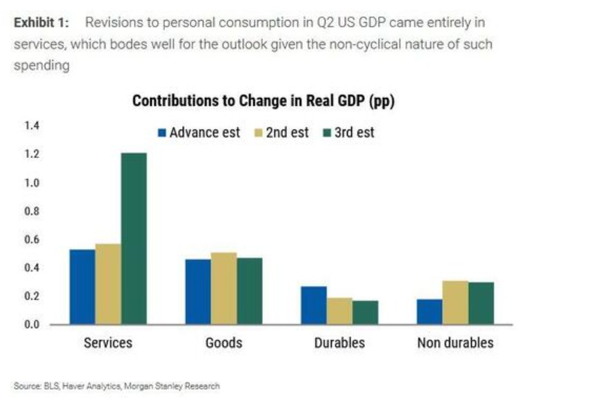 據摩根士丹利數據,經濟增長最終取決於支出,而最新的支出數據顯示經濟穩健甚至強勁。儘管二季度 GDP 數據相對陳舊,但顯示家庭服務支出有所回升,根據現有數據,三季度消費支出增長接近 3%。