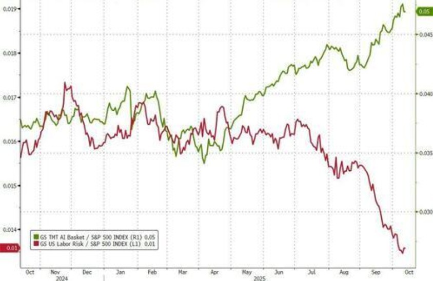 高盛的最新研究進一步印證了這一矛盾。該行指出,美國股市的兩個主要主題基本保持不變:人工智能的持續發展推動 AI 股票籃子 (GSTMTAIP) 表現優異,而對勞動力市場的持續擔憂則反映在勞動力敏感籃子 (GSXULABR) 的表現不佳上。