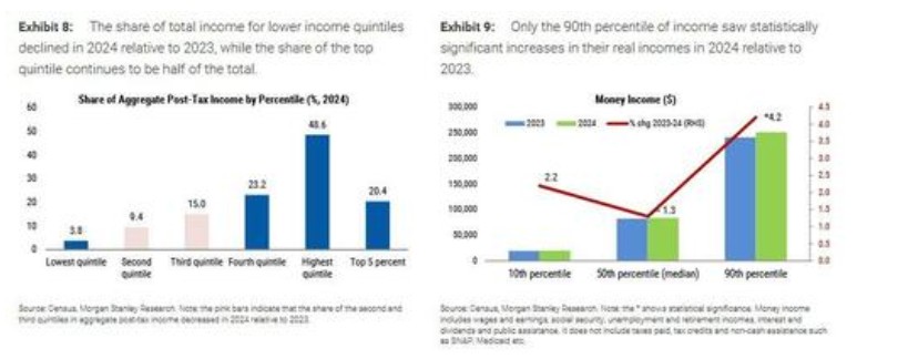 美國消費支出和 AI 資本支出表現強勁,三季度消費支出增長接近 3%,高收入家庭財富大幅增長推動消費。然而,就業市場明顯放緩,失業率上升,勞動收入增長停滯。摩根士丹利警告稱,這種 “精神分裂” 的數據狀況正在給資產定價帶來重大挑戰。