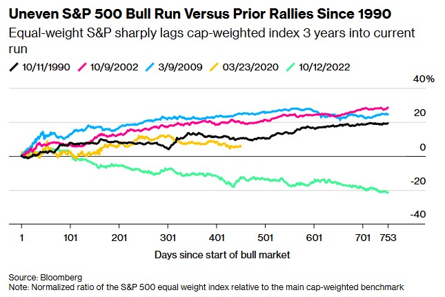 以標普 500 等權重指數為例,自 2022 年 10 月以來的表現落後於標普 500 指數達 21 個百分點——這是自上世紀 90 年代以來,牛市開啓階段等權重指數最大幅度的相對落後。數據顯示,在此後的三次牛市中,等權重指數到第三年時平均超越主指數 24 個百分點。