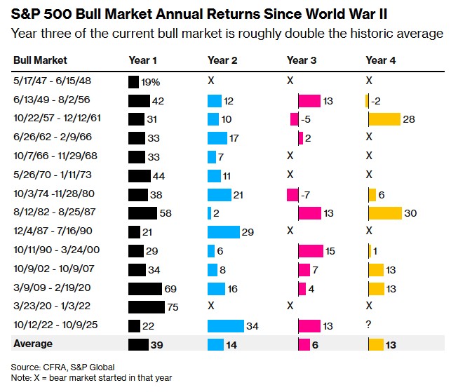 儘管如此,股市多頭仍有歷史數據作支撐。CFRA 數據顯示,自二戰以來,牛市平均持續 4.6 年,標普 500 指數平均累計回報約 157%。因此,當前這輪牛市僅三年、回報 83%,理論上仍有相當大的上漲空間,也為科技巨頭之外的板塊提供了補漲餘地。