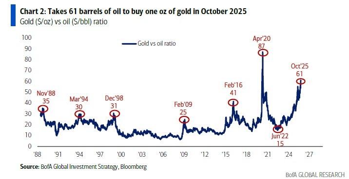 Hartnett noted significant changes in the commodities market. In June 2022, 15 barrels of oil could buy 1 ounce of gold; now it takes 61 barrels, a combination of a sharp decline in oil prices alongside a significant rise in gold that is historically anomalous