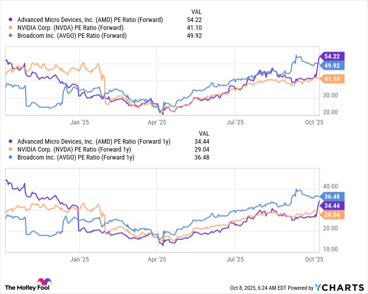 Both Broadcom and AMD's stock have popped on news of chip deals with OpenAI; however, this pop has caused them to get far more expensive than Nvidia. When various forward price-to-earnings (P/E) metrics are examined, Nvidia still trades at a discount to its peers despite much better results.
