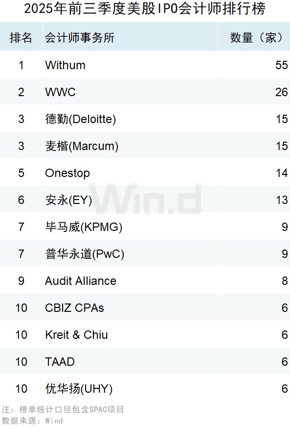 Withum ranks first in the accountant ranking with participation in 55 IPOs of listed companies; WWC ranks second with participation in 26 companies' IPO projects; Deloitte and Marcum rank third with participation in 15 companies' IPO projects.