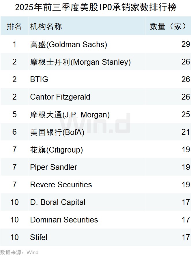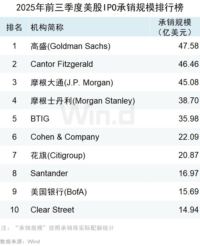 In the first three quarters of 2025, in terms of IPO underwriting amounts, Goldman Sachs ranked first with an underwriting amount of $4.758 billion and 29 deals; Cantor Fitzgerald ranked second with $4.646 billion and 26 deals; and JPMorgan Chase ranked third with $4.508 billion and 25 deals.