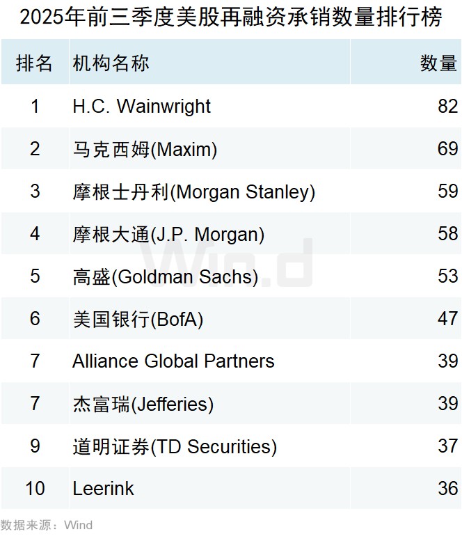 H.C. Wainwright participated in 82 refinancing events in the first three quarters of 2025, ranking first in the refinancing underwriting quantity ranking; Maxim ranks second with 69 refinancing underwritings; Morgan Stanley ranks third with 59 refinancing underwritings.