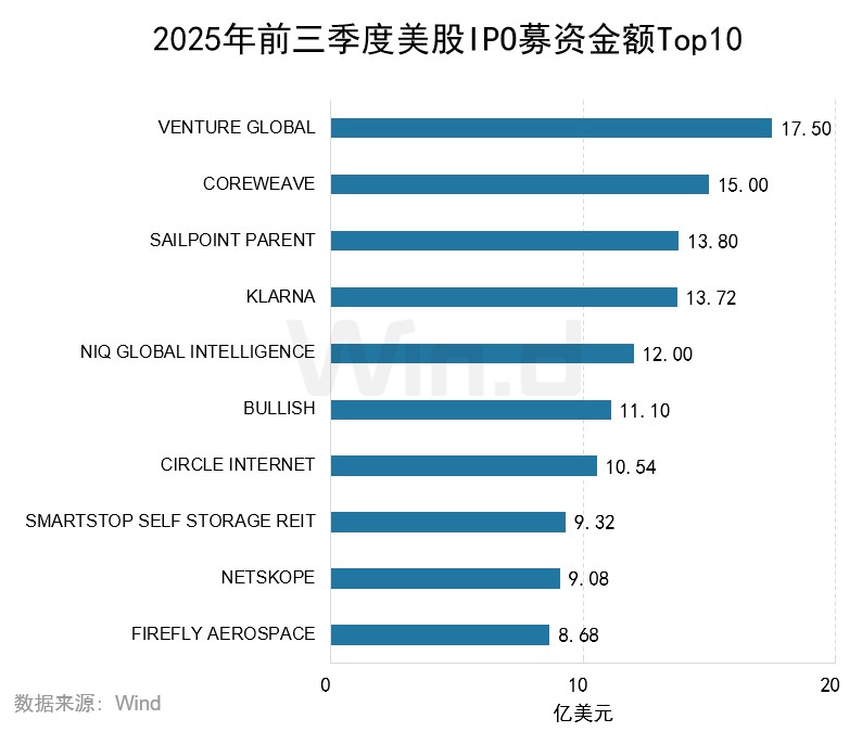 The company with the highest IPO financing amount is Venture Global, at $1.75 billion; CoreWeave and SailPoint Parent rank second and third with $1.5 billion and $1.38 billion, respectively. The top ten IPO projects raised a total of $12.074 billion, accounting for 25.72% of the total IPO fundraising amount