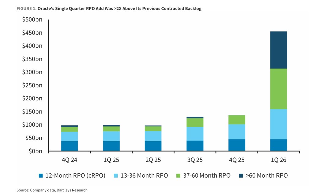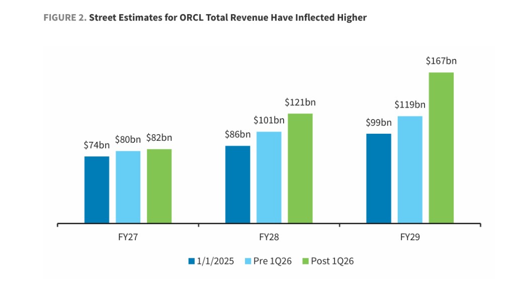 在第一財季獲得創紀錄的 3170 億美元 RPO 增量(是其此前 RPO 存量的兩倍多)後,甲骨文已經成功地將一個關於長期增長的宏大敍事擺在了投資者面前。這一驚人的增長促使市場分析師大幅上調預期,其中對甲骨文 2029 財年的營收預測從 990 億美元飆升至 1670 億美元。