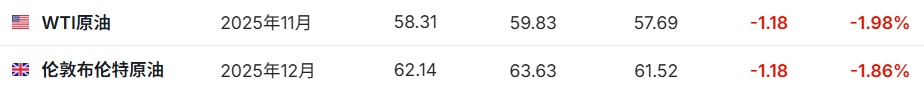 3. 截至發稿,WTI 原油跌1.98%,報 58.31 美元/桶。布倫特原油跌1.86%,報 62.14 美元/桶。