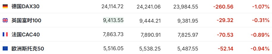 2. 截至發稿,德國 DAX 指數跌1.07%,英國富時 100 指數跌0.31%,法國 CAC40 指數跌0.89%,歐洲斯托克 50 指數跌0.94%。
