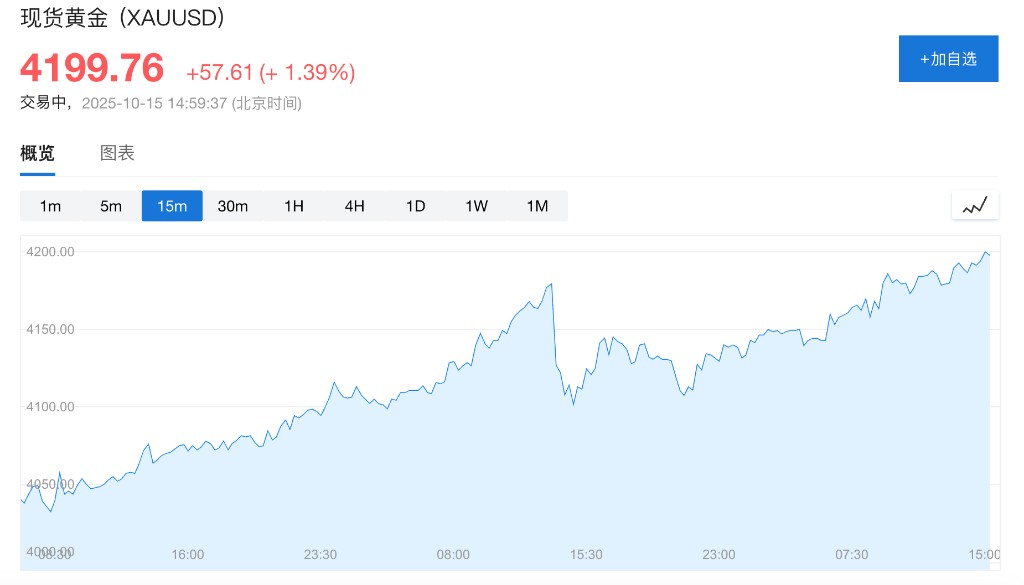 On October 15, Asian stock markets rose, European stocks opened higher across the board, and spot gold broke through $4,200 per ounce, rising nearly 1.4% during the day.