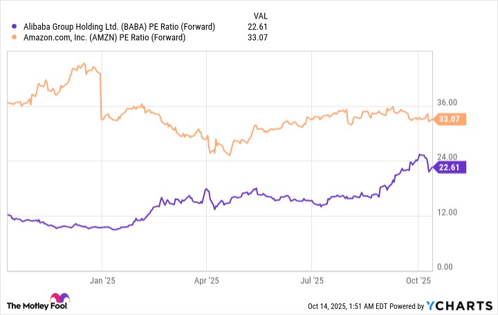 With AI contributing to Alibaba and Amazon's rising sales, deciding which to invest in requires looking at additional factors. One is the forward price-to-earnings (P/E) ratio of their stocks.