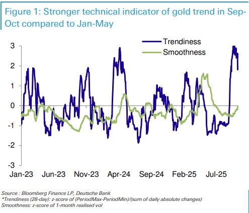 Finally, from a technical indicator perspective, the Deutsche Bank team believes that there may have been signs of a "trend peak" during the period from September to October — their model shows that the deviation of gold prices from the trend has far exceeded historical averages.
