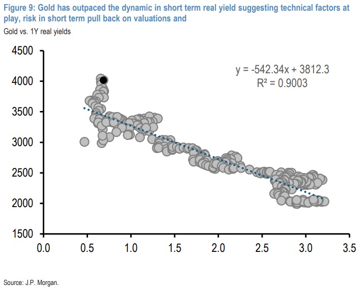 JP Morgan noted that the recent surge in gold has far exceeded the increases typically explained by a decline in one-year real interest rates. Theoretically, when the real returns on other "safe assets" decline, gold becomes more attractive.