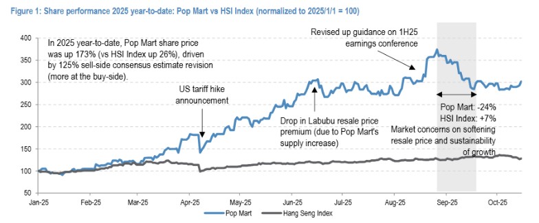 泡泡瑪特股價從近期高點 335.40 港元下跌 24% 至 254 港元,而同期恒生指數卻上漲了 7%。