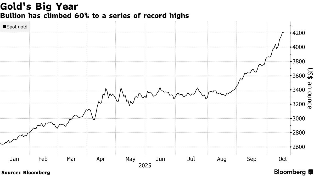 The foundation of the gold bull market is solid! Gold prices have reached a new high, breaking through $4,220! A cumulative surge of 60% this year!