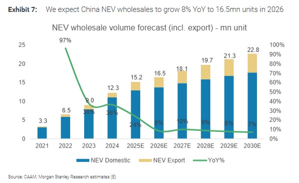 Therefore, the report raised its forecast for total automobile sales in China in 2025 by 6% to 29.9 million units, a year-on-year increase of 9%. Among them, the forecast for new energy vehicle (NEV) sales was raised by 2% to 15.2 million units, a year-on-year increase of 24%, with a penetration rate expected to reach 51%.