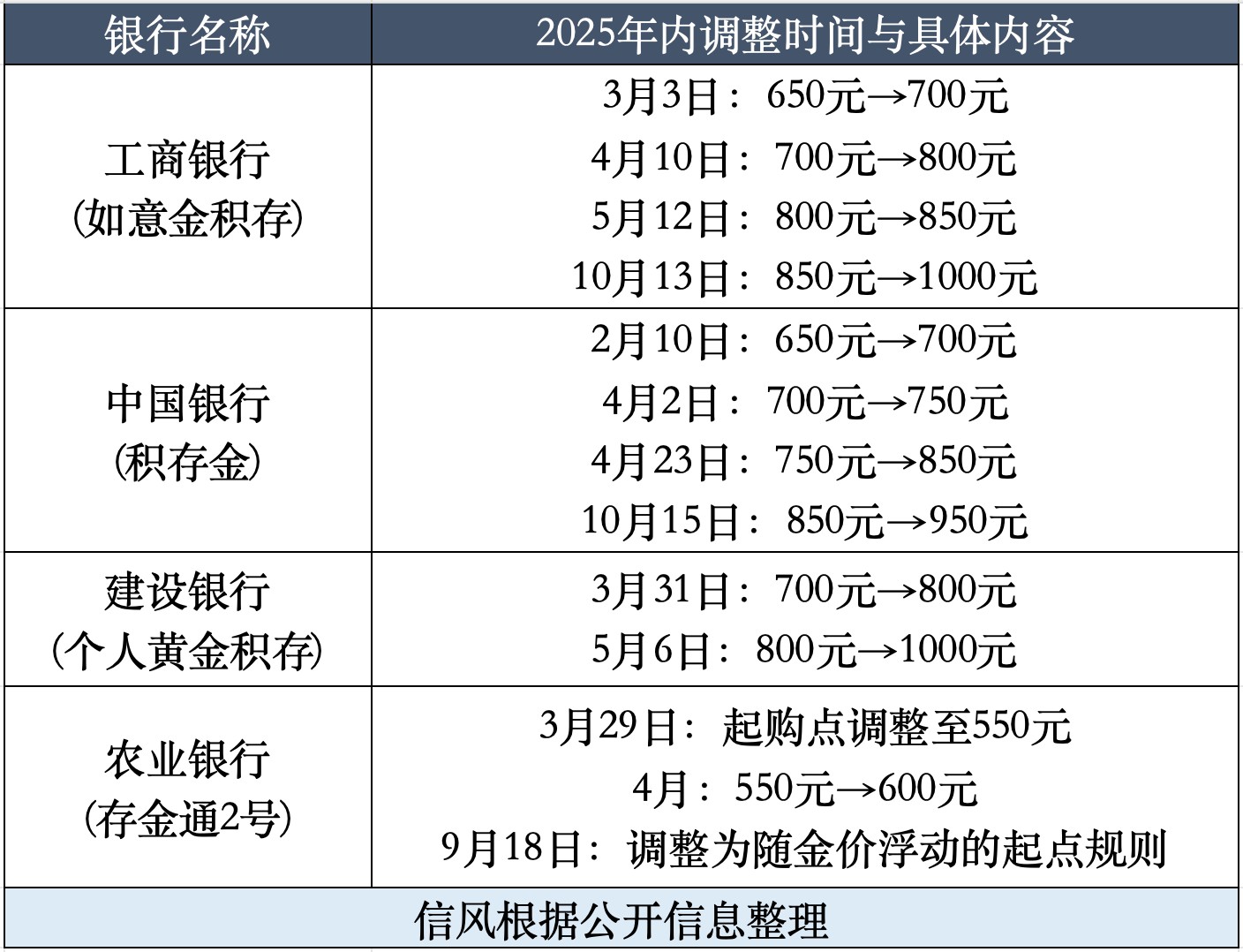 信風梳理發現,在金價水漲船高的過程中,四大行年內均已多次上調積存金起購價,工行、建行的積存金起購價均已調整為 1000 元,僅中行停留在 950 元;