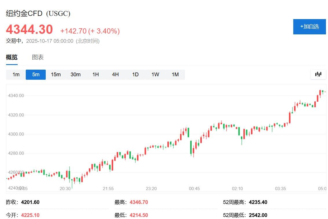 美東時間 10 月 16 日美股午盤,黃金連續第四個交易日創盤中新高,盤中首次突破 4300 美元大關。美股盤後,COMEX 12 月黃金期貨漲至 4340 美元上方,較週三收盤漲超 3%。倫敦現貨黃金曾漲至 4330 美元上方,日內漲近 3%。黃金今年初以來已累漲約 60%。