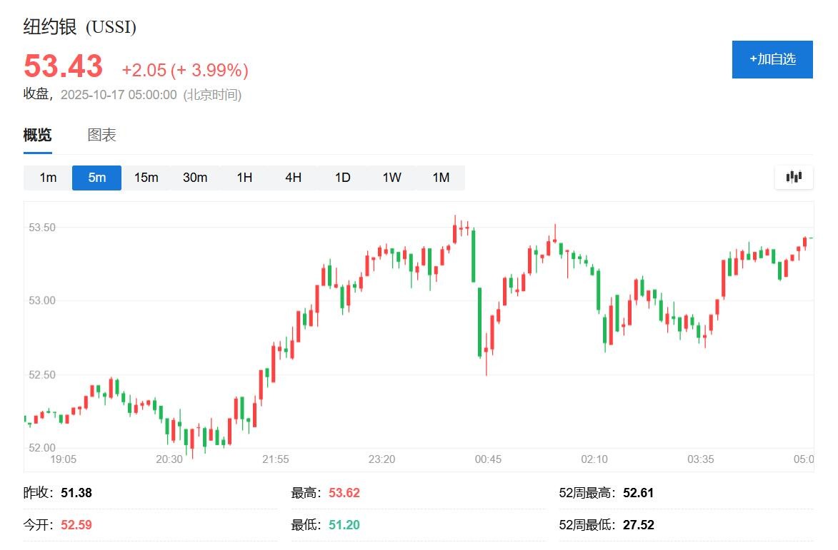 週四美股午盤之初,紐約期銀和倫敦現貨銀價刷新週二所創的盤中新高。COMEX 12 月白銀期貨曾漲破 53.60 美元,日內漲約 4.4%,現貨白銀曾漲至 54.20 美元上方,日內漲超 2%。