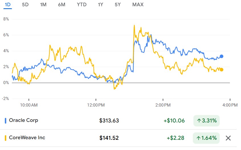 Following this data disclosure, market confidence in the profitability of AI infrastructure businesses increased, with Oracle's stock price rising more than 5% at one point before retreating, while also boosting the stock price of industry peer CoreWeave.