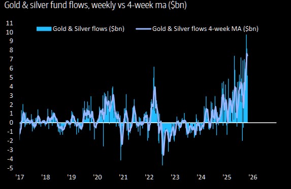 However, according to Bank of America data, net inflows into gold ETFs over the past 10 weeks have reached $34.2 billion, setting a historical record.
