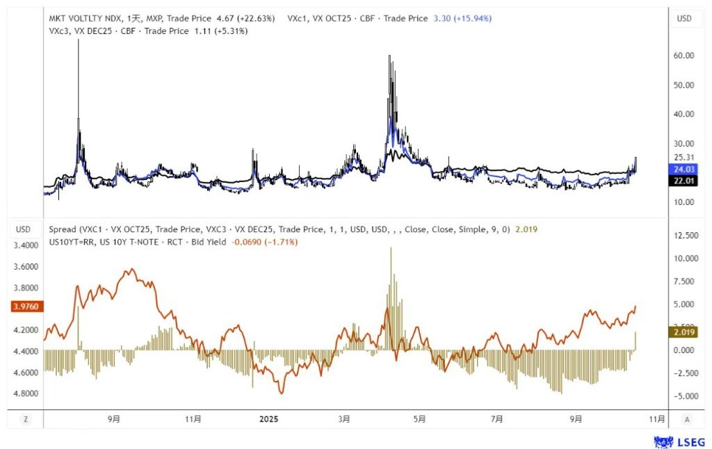 Update on VIX (October 17): The Back structure of VIX has increased, indicating that implied market risks are intensifying. The renewed tariffs on CNUS (rare earths) and recent comments from Benson about "decoupling" have heightened market concerns. The already tense market nerves (worries about high valuations) have been exacerbated, and with U.S. Treasury yields falling below 4%, there are growing fears that risks could lead to a recession. As we approach the end of the month (whether there will be a meeting and discussions), this will be a critical moment. If the U.S. and China continue down this path, expectations may turn into reality.