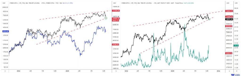 The massive convergence triangle of BTC formed over two years shows that each support point corresponds to a spike in VIX volatility. From Nvidia's explosive gains last July to the tariffs in April and the recent G2 tariffs on rare earths, panic does not actually drive BTC; rather, it reflects the high correlation between BTC and the AI industry (after all, the main asset weight in the benchmark market for VIX is AI assets). We are at a very critical moment; the technical analysis support line is in place. If recession risks further increase, with U.S. Treasury yields already at 4%, it solidifies the recession narrative. The collapse of demand expectations will be a heavy blow to massive AI capital expenditures. If volatility continues to rise, BTC may accelerate its flash crash. In just a few days, we will see whether the U.S. and China are merely playing a game of bargaining before negotiations or if they are truly "decoupling."
