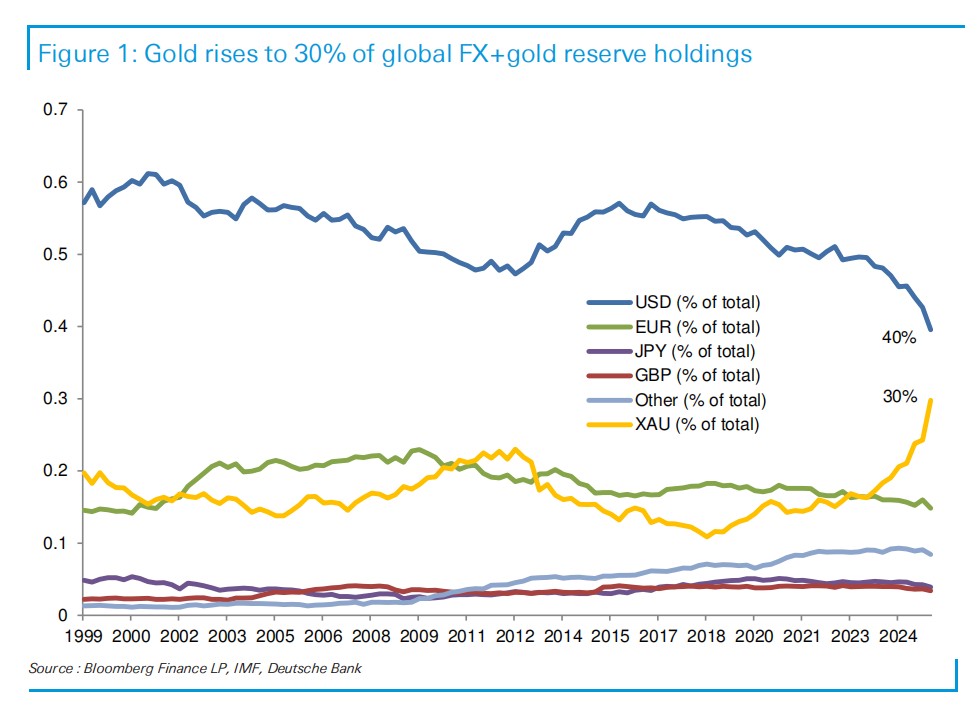 According to Deutsche Bank, the share of gold in global central banks' "foreign exchange + gold" reserves has rapidly increased from 24% at the end of June this year to the current 30%. During the same period, the share of the US dollar has decreased from 43% to 40%. To match the dollar's share, the price of gold would need to rise to USD 5,790 per ounce, assuming the current holdings remain unchanged