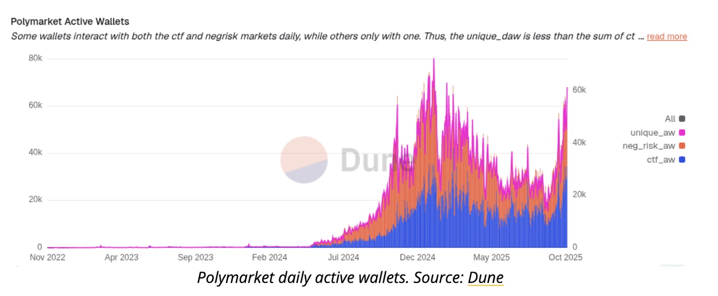 Polymarket is a cryptocurrency-based platform that allows users to bet on the outcomes of real-world events such as elections and sports events using stablecoins. The platform gained prominence during the 2024 U.S. presidential election, with activity and trading volume reaching historic highs Dune data shows that the number of daily active wallets peaked at over 72,600 on January 19, 2025. Although there has been a decline since then, the platform's activity remains strong, with transaction volumes exceeding $1 billion this month and a cumulative total transaction amount surpassing $15.7 billion.