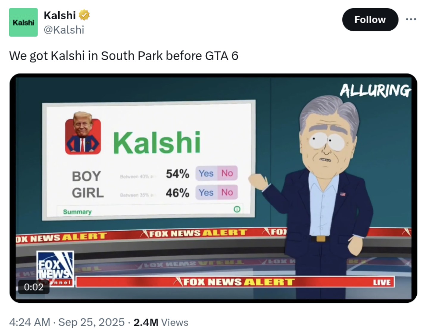 Recently, Kalshi gained popularity on social media for its real-time screen displaying mayoral election odds in New York City, with related videos on the X platform nearing 13 million views. The platform even appeared in the well-known animated series "South Park," highlighting its cultural influence. These platforms have successfully brought prediction markets into a broader view by capturing public interest in hot events.