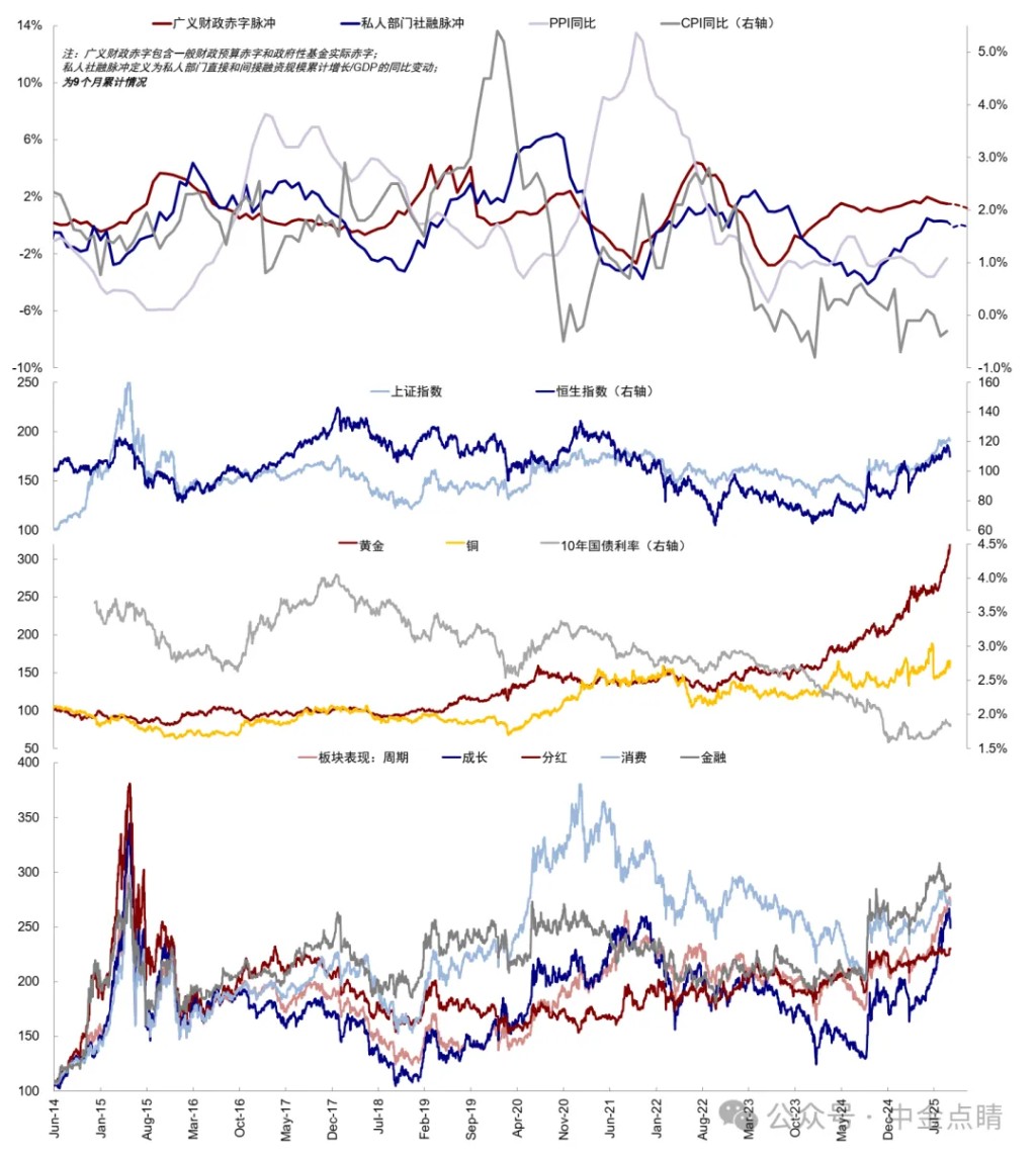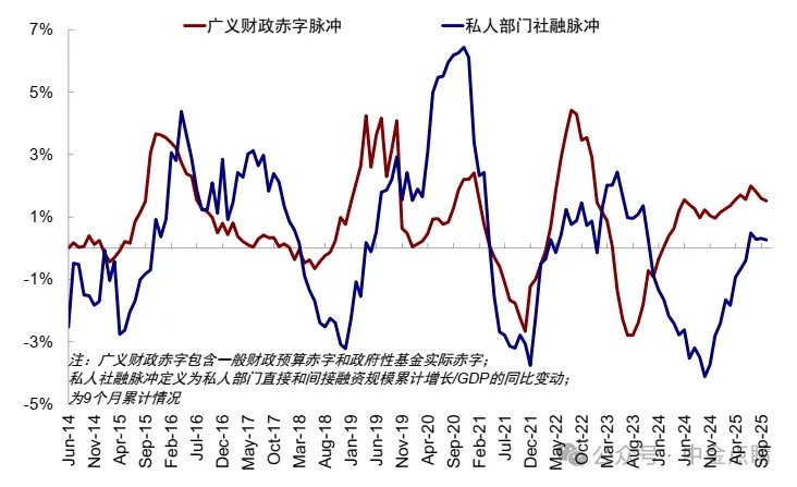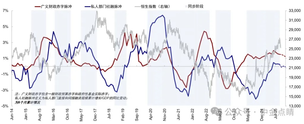 多數情況下,廣義財政赤字和私人部門社融脈衝都不會同步,畢竟二者出發點不同。私人部門融資主要反映經濟的自發需求,而政府財政天然具有逆週期調節功能。當經濟下行時,政府會加大財政支撐,而經濟過熱時則適度收斂,所以廣義財政赤字脈衝和私人部門社融脈衝多數時間互相對沖。在某些階段,因為政策響應速度的問題,也會同步向上或向下。因此,我們既要觀察整體走向,也要拆開看由誰驅動,以判斷對資產表現的不同含義。