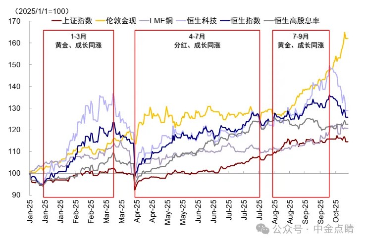 今年整體強勁的市場環境中,有一些讓人頗為費解的地方,例如風險(美港 A 三地的成長股)和避險資產(黃金)同漲,通縮(分紅)與通脹(黃金)資產同漲。正常情況下,黃金、分紅和成長這三大類不同屬性的資產定價底層邏輯是不同的:黃金更多反映避險和儲值價值,分紅在通縮或防禦環境下跑贏,成長則對應通脹和風險偏高改善的環境。但是反觀今年,1-3 月黃金與成長同漲,4-7 月為分紅與成長同漲,7-9 月又是黃金與成長同漲,看起來不合常理。