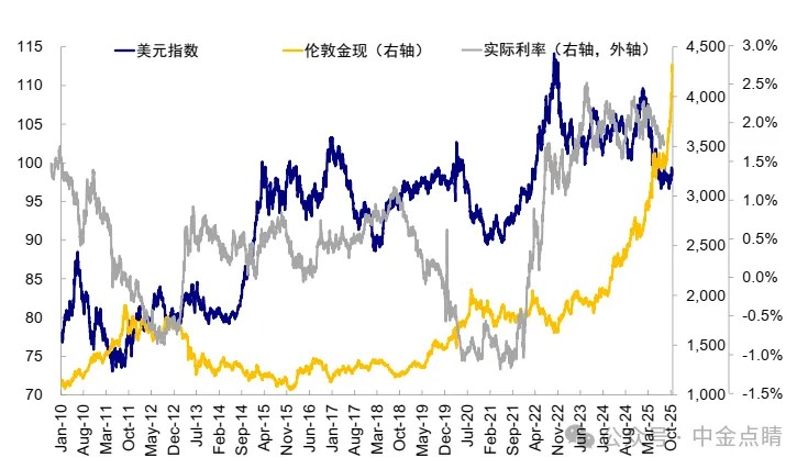 圖表 3:黃金價格 “背離” 美元和實際利率框架