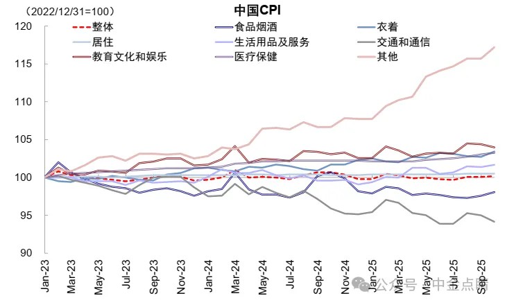 其次,當前的宏觀環境也不是一個簡單的通脹或通縮就能概括的。對於中國,雖然受地產和上游資源品影響,整體經濟和表觀價格特別是 PPI 依然處於下行區間,但過剩的流動性導致但凡是有回報甚至有回報預期的 “稀缺” 資產都會因為資金的大量湧入而漲價,呈現局部通脹現象,此前的國債和分紅、當前的黃金和科創,都體現了相對的通脹(即相對購買力下降),即便是 CPI 的分項中也體現了這一通縮和通脹並存現象。因此,更確切地講,中國當前的局面應該是整體物價下行掩蓋下的過剩流動性和局部通脹,這才會有分紅和成長都漲,本質是流動性對稀缺回報的追求。