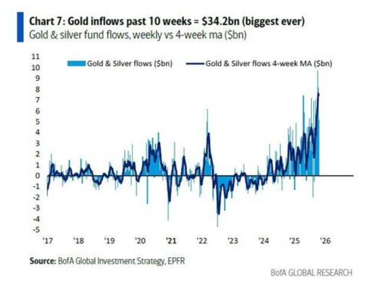 黃金市場同樣火熱,過去 10 周累計流入 342 億美元,創下歷史最高紀錄。