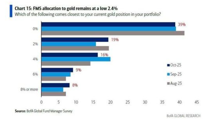他指出,美國銀行高淨值客户的黃金配置比例僅為 0.5%,而全球基金經理的配置比例也只有 2.4%,遠未達到飽和。在他看來,只有發生重大地緣政治緩和或 AI 泡沫破裂導致實際利率飆升等黑天鵝事件,才能終結黃金的牛市。