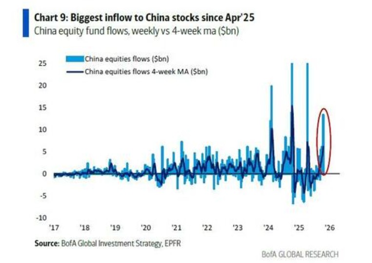 此外,中國股票市場也出現了自 2025 年 4 月以來最大的單週資金流入,達 134 億美元。這種 “買入一切” 的勢頭,凸顯了在降息預期下市場強烈的風險偏好。