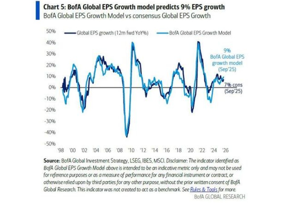 在國際市場方面,Hartnett 繼續看好國際股市,他預計恒生指數將升至 33000 點上方。美國銀行的全球每股收益(EPS)增長模型預測,未來 12 個月全球 EPS 將增長 9%,高於市場共識。